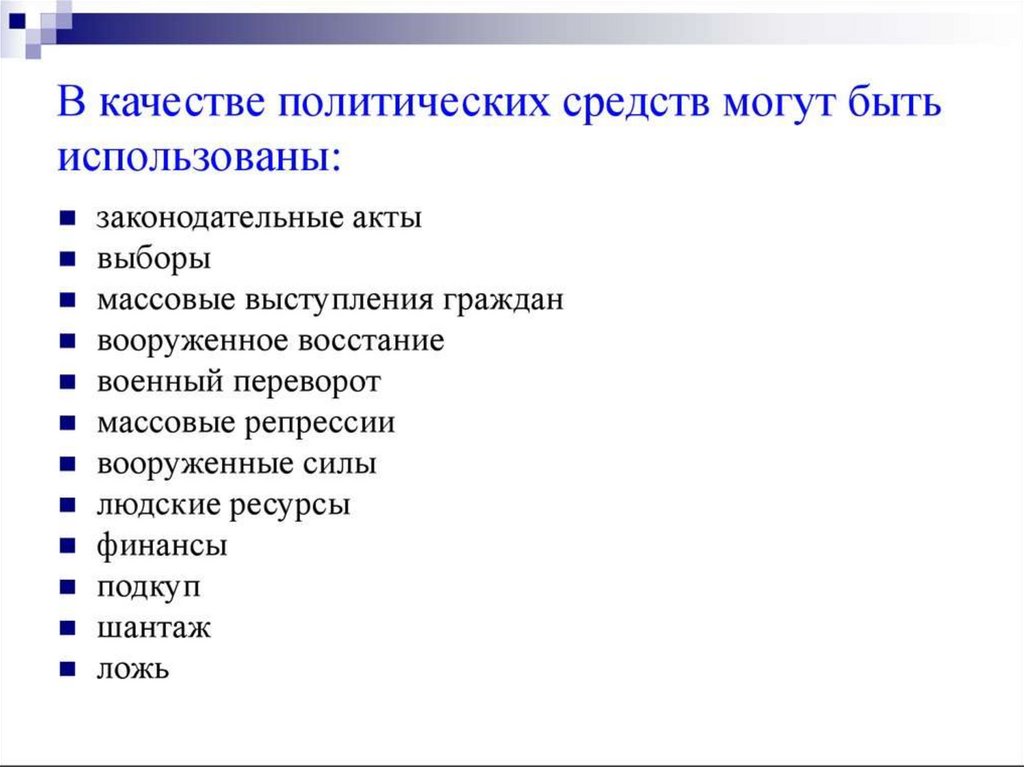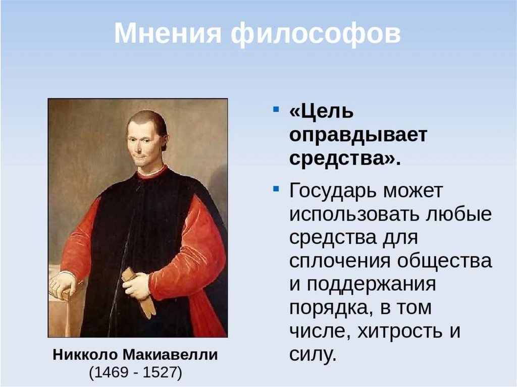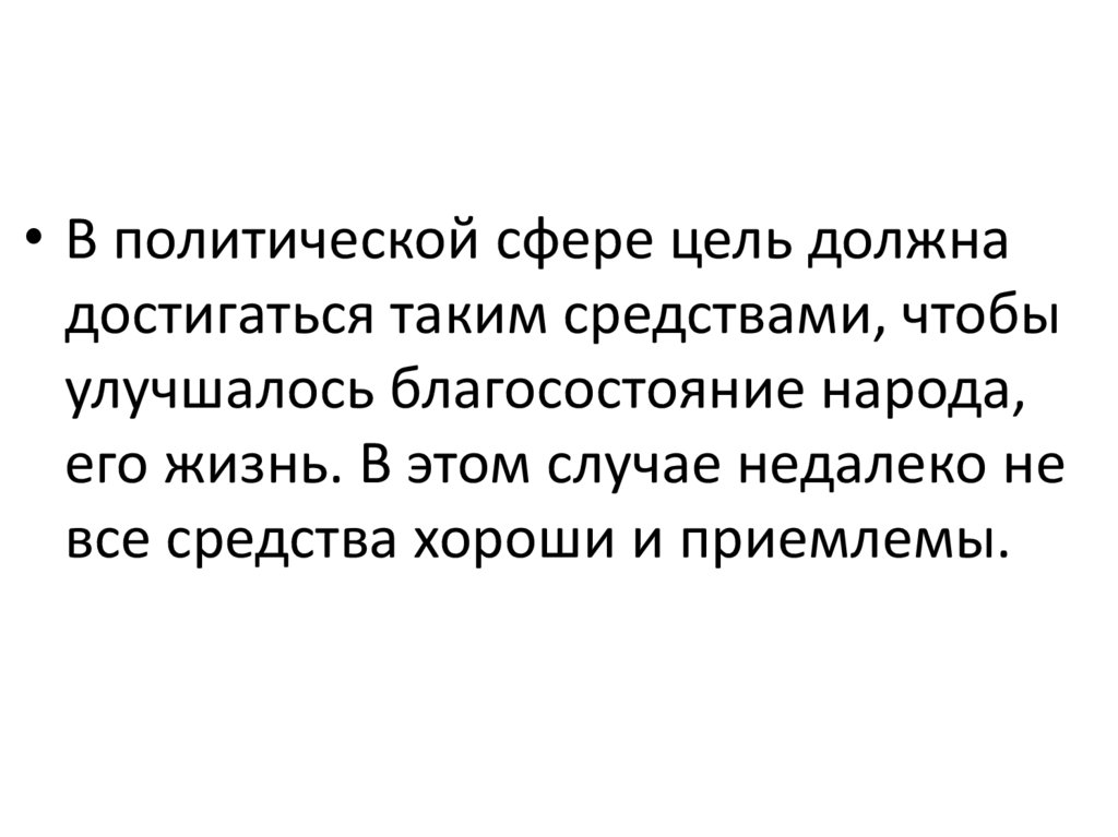 • В политической сфере цель должнадостигаться таким средствами, чтобы