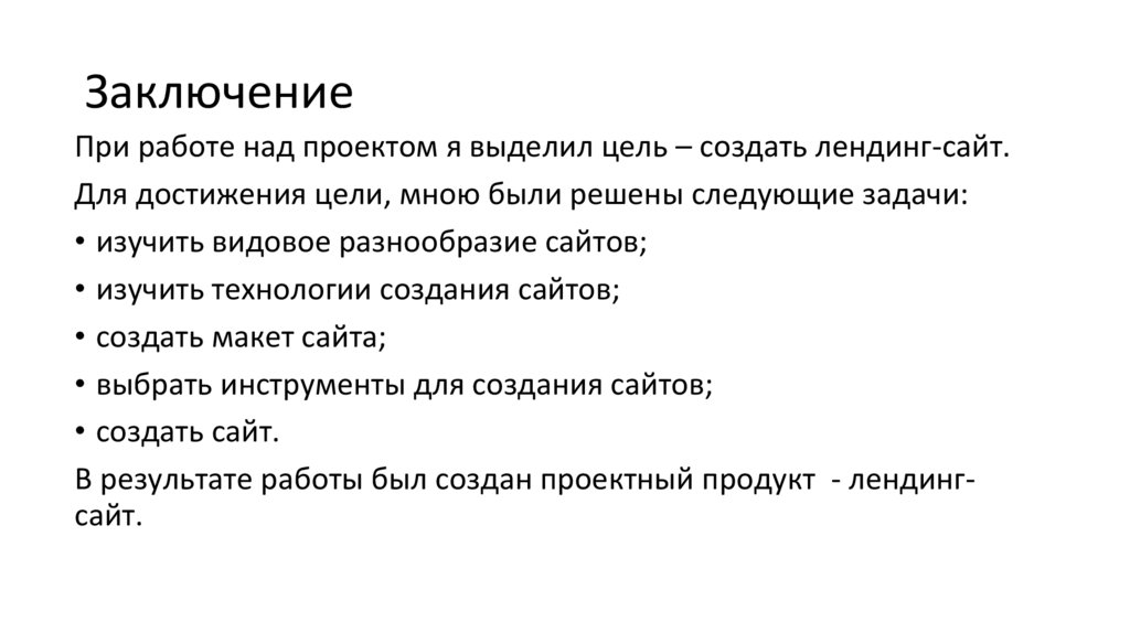 ЗаключениеПри работе над проектом я выделил цель – создать лендинг-сайт.