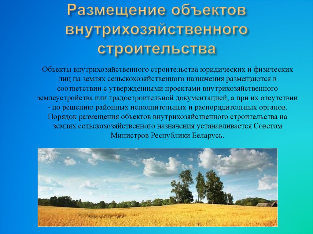 Объекты внутрихозяйственного строительства юридических и физическихлиц на землях сельскохозяйственного назначения размещаются в
