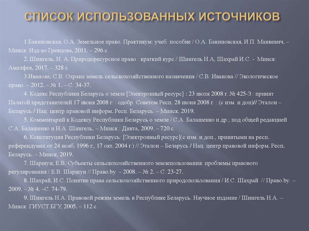 1.Бакиновская, О.А. Земельное право. Практикум: учеб. пособие / О.А. Бакиновская, И.П. Манкевич. –Минск: Изд-во Гревцова, 2011. – 296 с.
