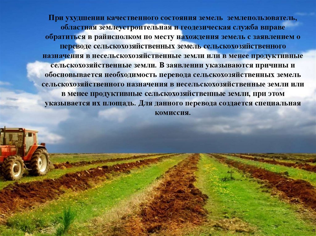 При ухудшении качественного состояния земель землепользователь,областная землеустроительная и геодезическая служба вправе