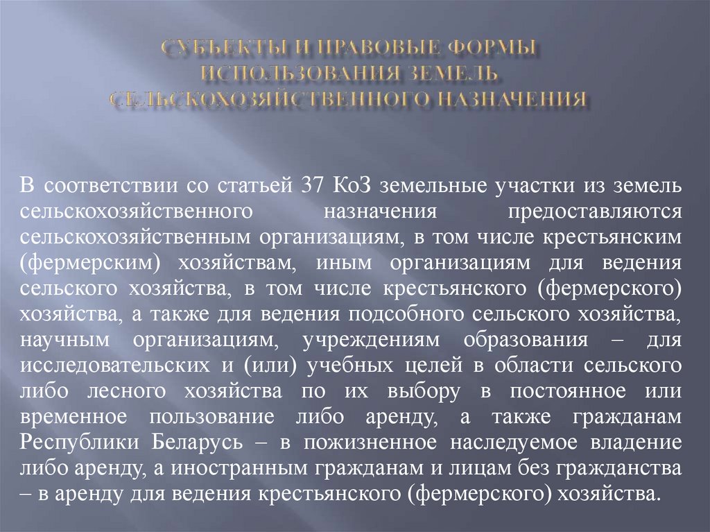 В соответствии со статьей 37 КоЗ земельные участки из земельсельскохозяйственного