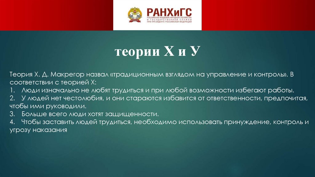 теории Х и УТеория Х. Д. Макрегор назвал «традиционным взглядом на управление и контроль». В
