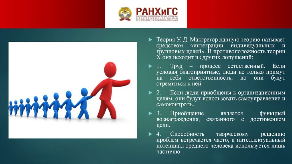 Теория У. Д. Макгрегор данную теорию называетсредством «интеграции индивидуальных и