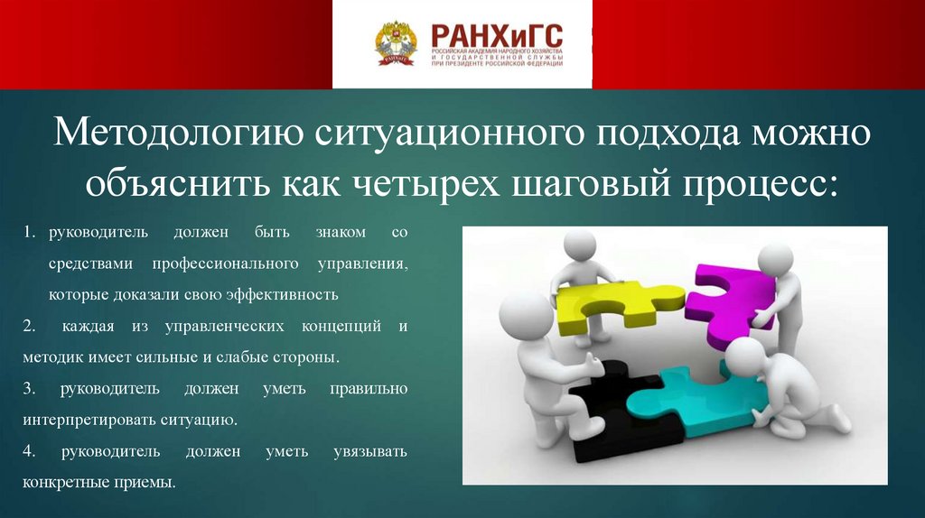 Методологию ситуационного подхода можнообъяснить как четырех шаговый процесс: