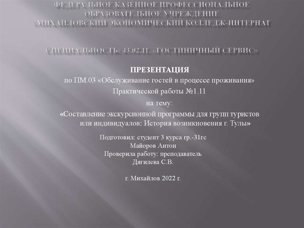 Составление экскурсионной программы для групп туристов или индивидуалов: История возникновения г. Тулы
