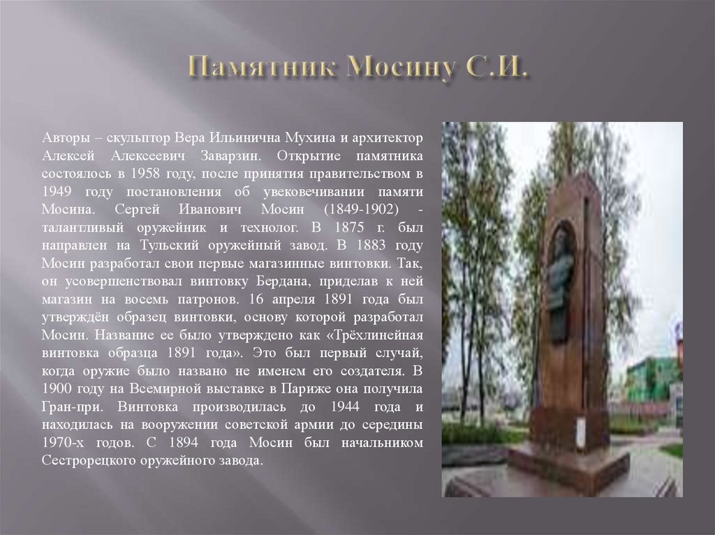 Мосина. Сергей Иванович Мосин (1849-1902) талантливый оружейник и технолог. В 1875 г. был