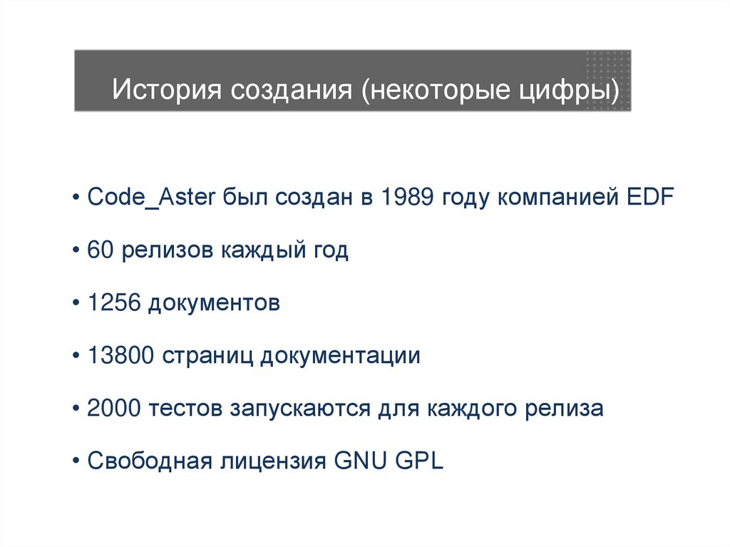 История создания (некоторые цифры)• Code_Aster был создан в 1989 году компанией EDF