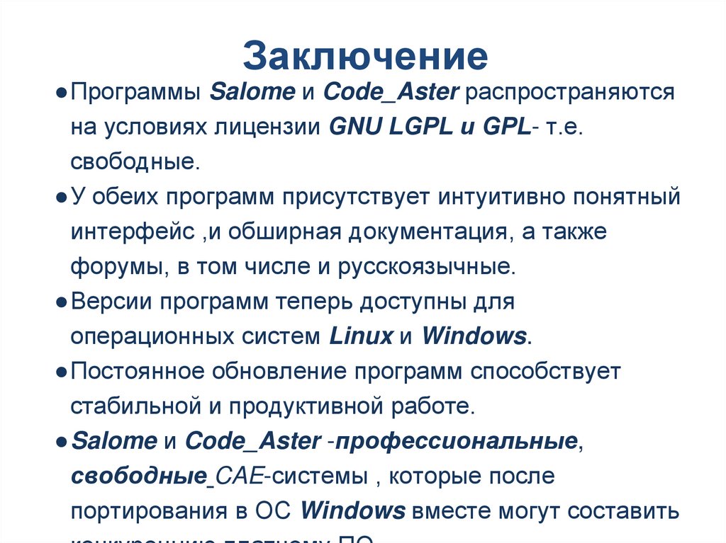 Заключение● Программы Salome и Code_Aster распространяются