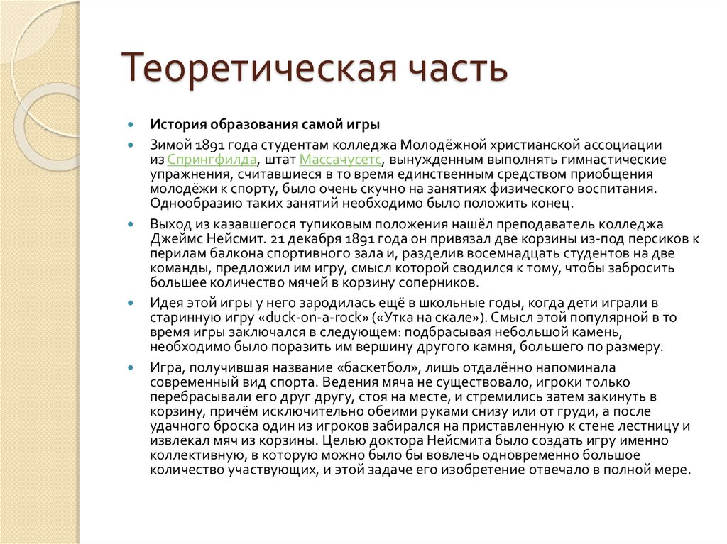 извлекал мяч из корзины. Целью доктора Нейсмита было создать игру именно