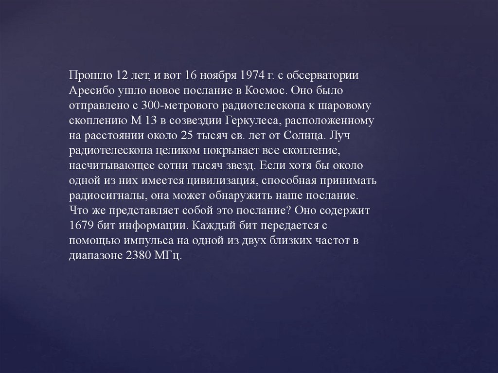 Прошло 12 лет, и вот 16 ноября 1974 г. с обсерваторииАресибо ушло новое послание в Космос. Оно было