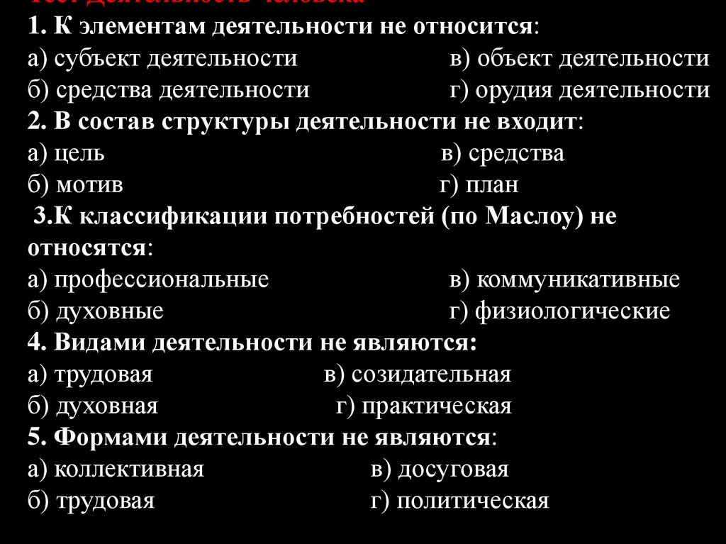 Тест Деятельность человека1. К элементам деятельности не относится: