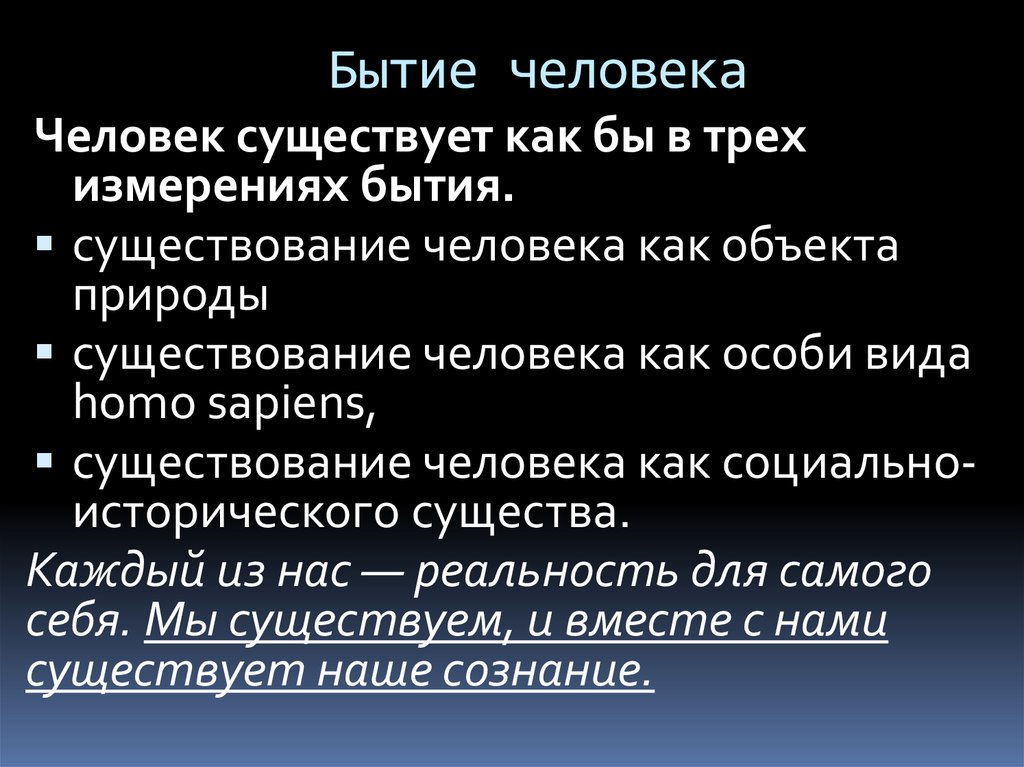 Бытие человекаЧеловек существует как бы в трех