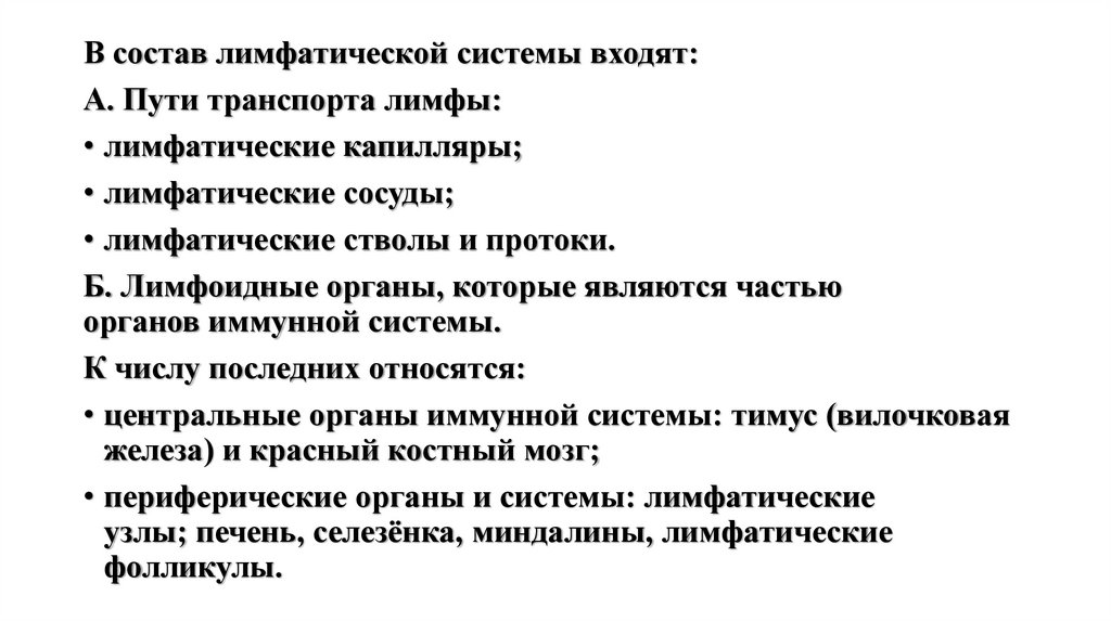 В состав лимфатической системы входят:А. Пути транспорта лимфы:
