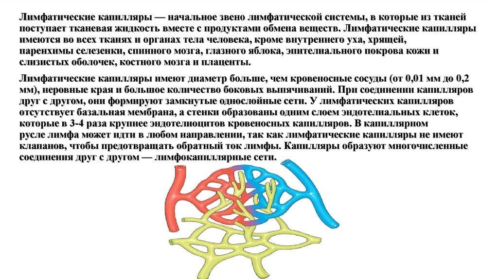 клапанов, чтобы предотвращать обратный ток лимфы. Капилляры образуют многочисленные