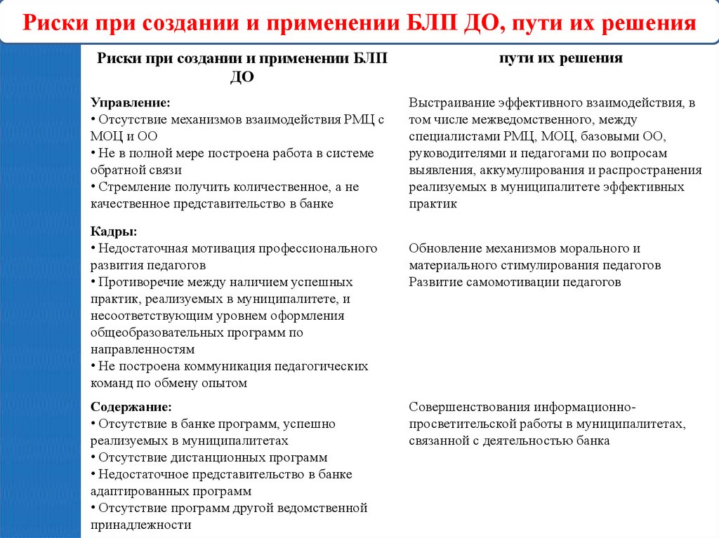 Риски при создании и применении БЛП ДО, пути их решенияРиски при создании и применении БЛП