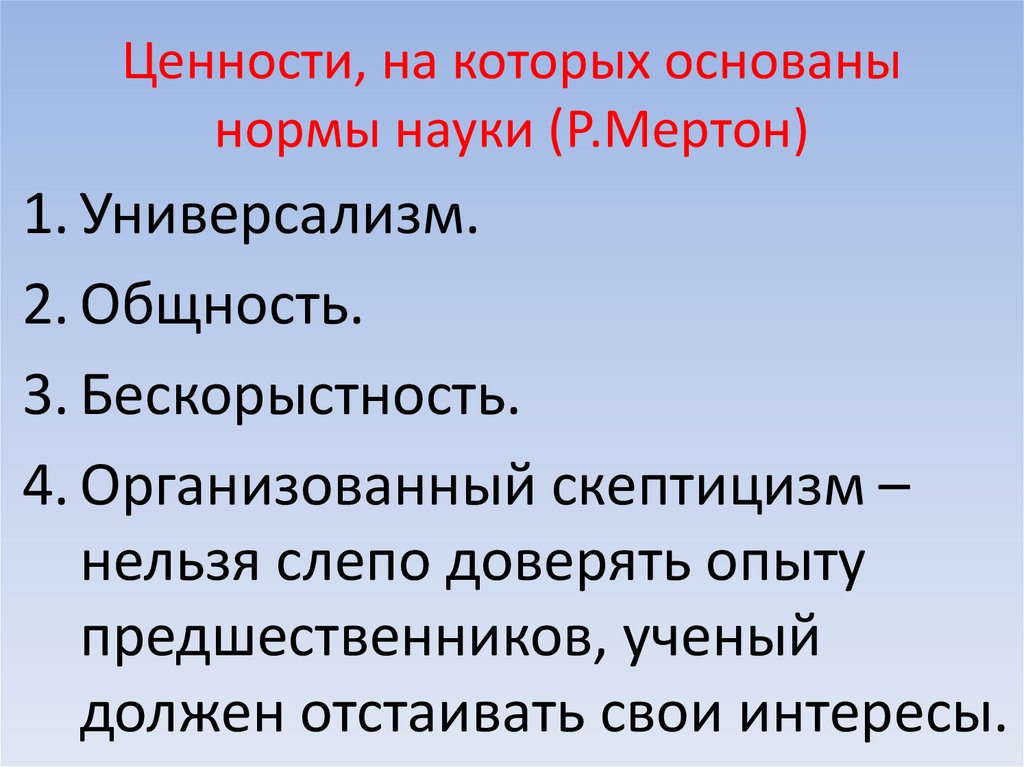 Ценности, на которых основанынормы науки (Р.Мертон)