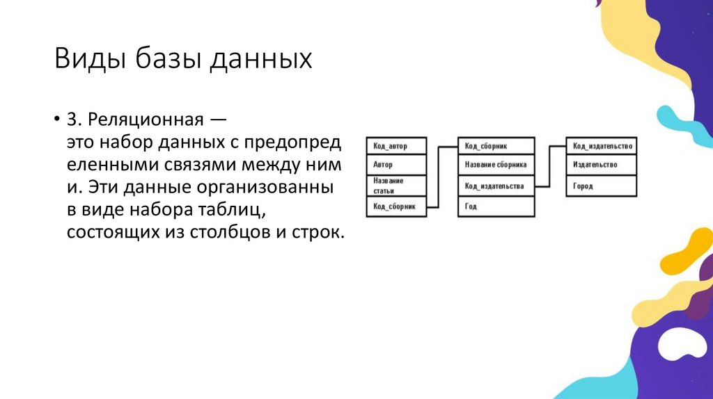Виды базы данных• 3. Реляционная —