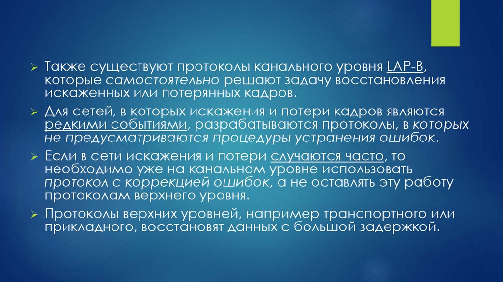 Также существуют протоколы канального уровня LAP-B,которые самостоятельно решают задачу восстановления