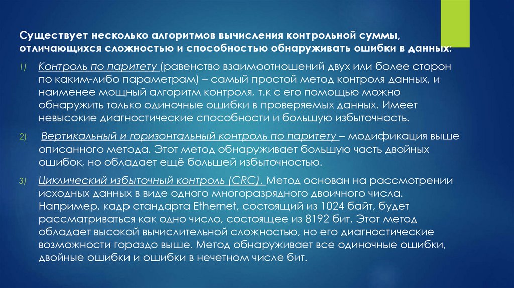 Существует несколько алгоритмов вычисления контрольной суммы,отличающихся сложностью и способностью обнаруживать ошибки в данных:
