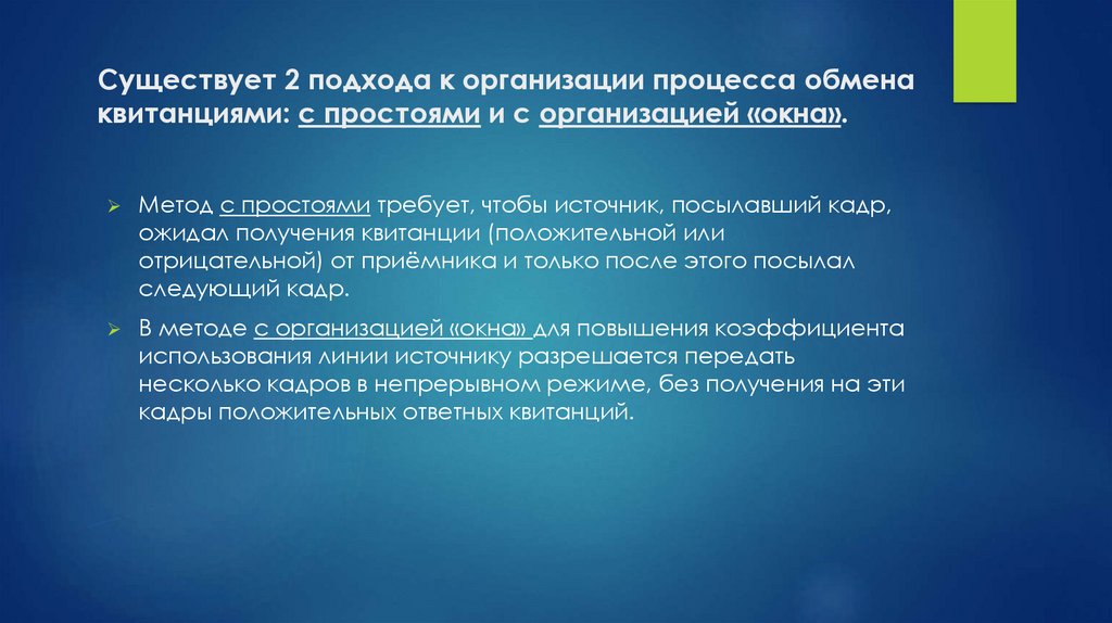 Существует 2 подхода к организации процесса обменаквитанциями: с простоями и с организацией «окна».