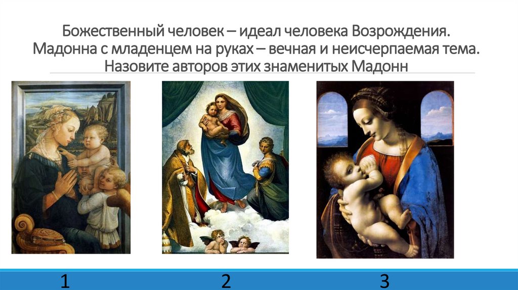 Божественный человек – идеал человека Возрождения.Мадонна с младенцем на руках – вечная и неисчерпаемая тема.