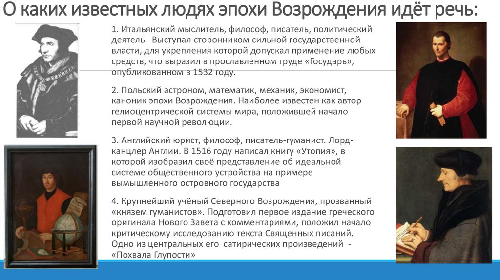 О каких известных людях эпохи Возрождения идёт речь:1. Итальянский мыслитель, философ, писатель, политический