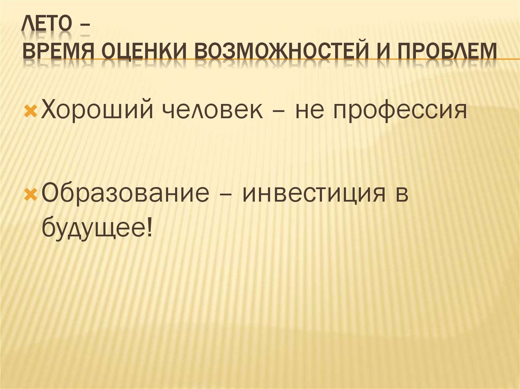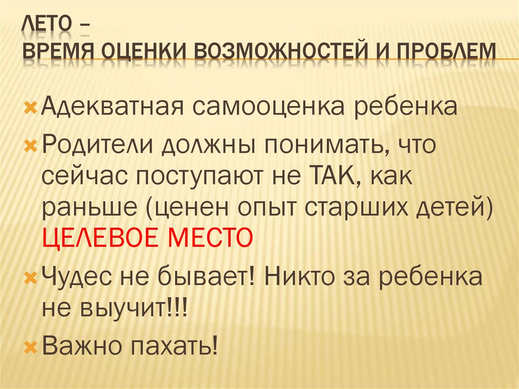ЛЕТО –ВРЕМЯ ОЦЕНКИ ВОЗМОЖНОСТЕЙ И ПРОБЛЕМ