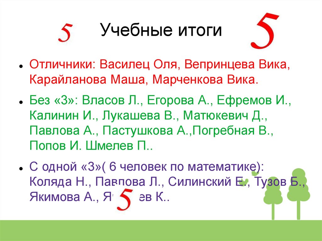 Учебные итогиОтличники: Василец Оля, Вепринцева Вика,