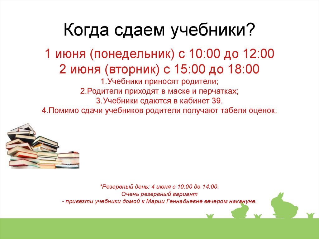 Когда сдаем учебники?1 июня (понедельник) с 10:00 до 12:00