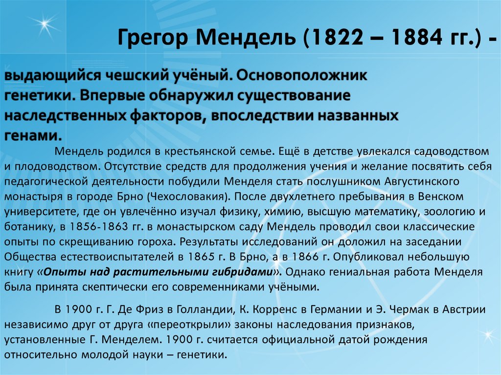 Грегор Мендель (1822 – 1884 гг.) выдающийся чешский учёный. Основоположникгенетики. Впервые обнаружил существование