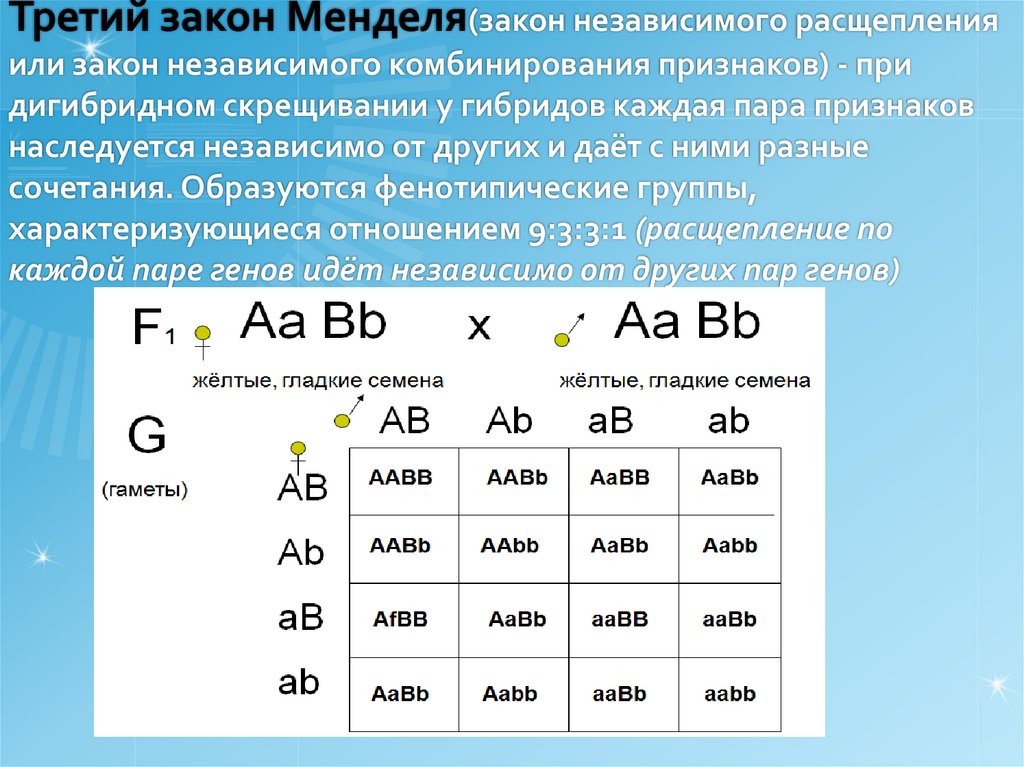 Третий закон Менделя(закон независимого расщепленияили закон независимого комбинирования признаков) - при