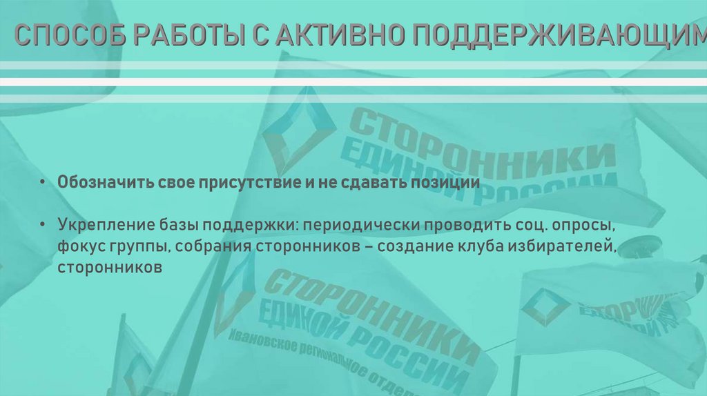 • Укрепление базы поддержки: периодически проводить соц. опросы,