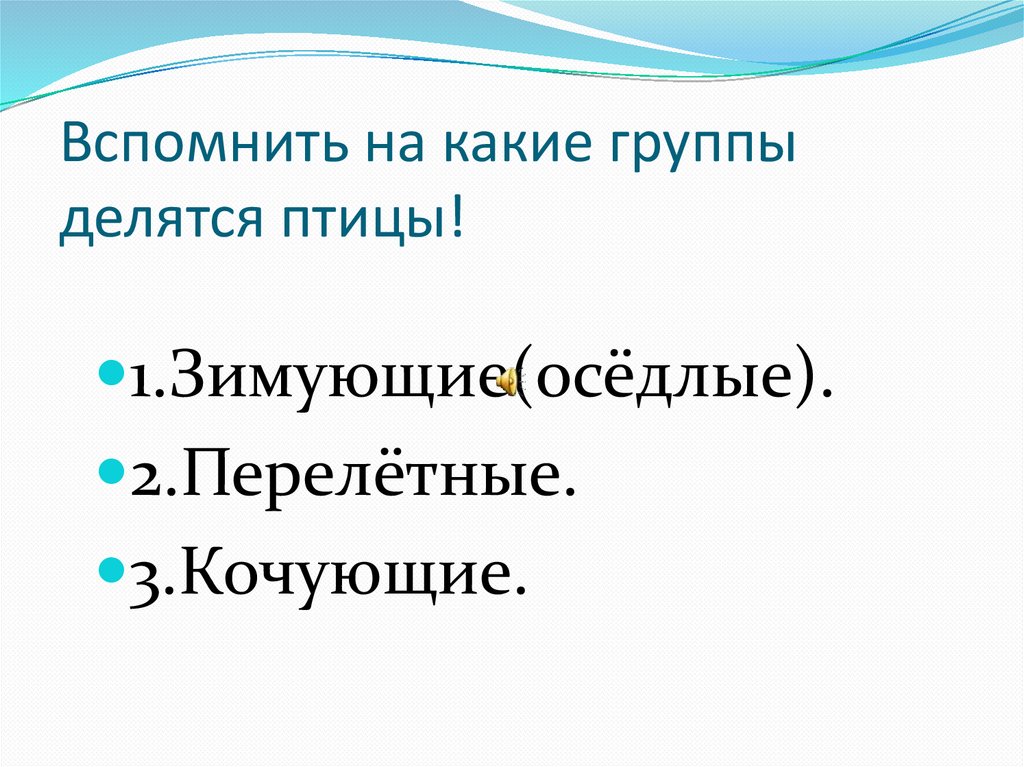 1.Вспомнить,на какие группы делятся птицы.
