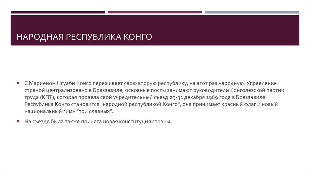 НАРОДНАЯ РЕСПУБЛИКА КОНГОС Мариеном Нгуаби Конго переживает свою вторую республику, на этот раз народную. Управление