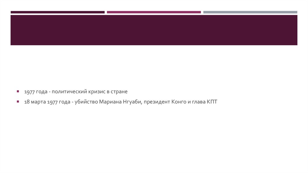 1977 года - политический кризис в стране18 марта 1977 года - убийство Мариана Нгуаби, президент Конго и глава КПТ
