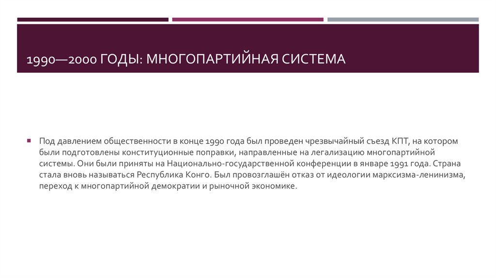 1990—2000 ГОДЫ: МНОГОПАРТИЙНАЯ СИСТЕМАПод давлением общественности в конце 1990 года был проведен чрезвычайный съезд КПТ, на котором