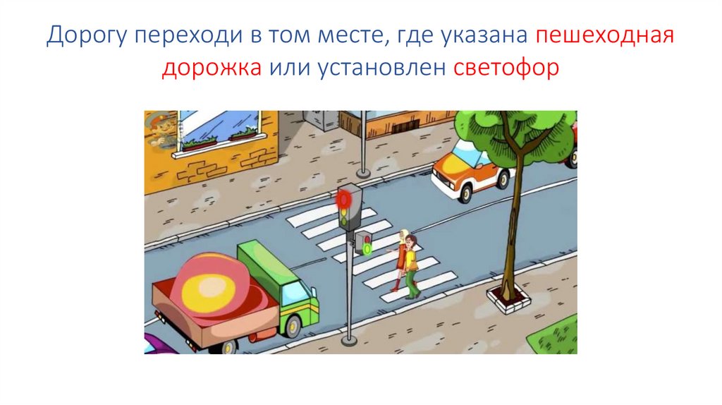 Дорогу переходи в том месте, где указана пешеходнаядорожка или установлен светофор