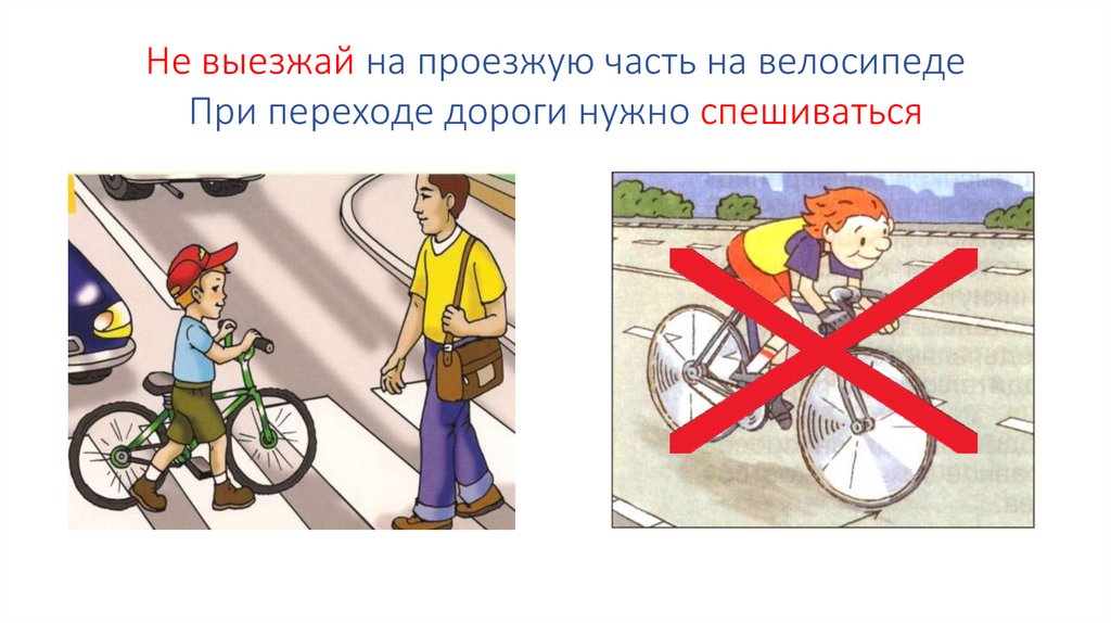 Не выезжай на проезжую часть на велосипедеПри переходе дороги нужно спешиваться
