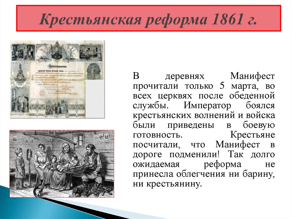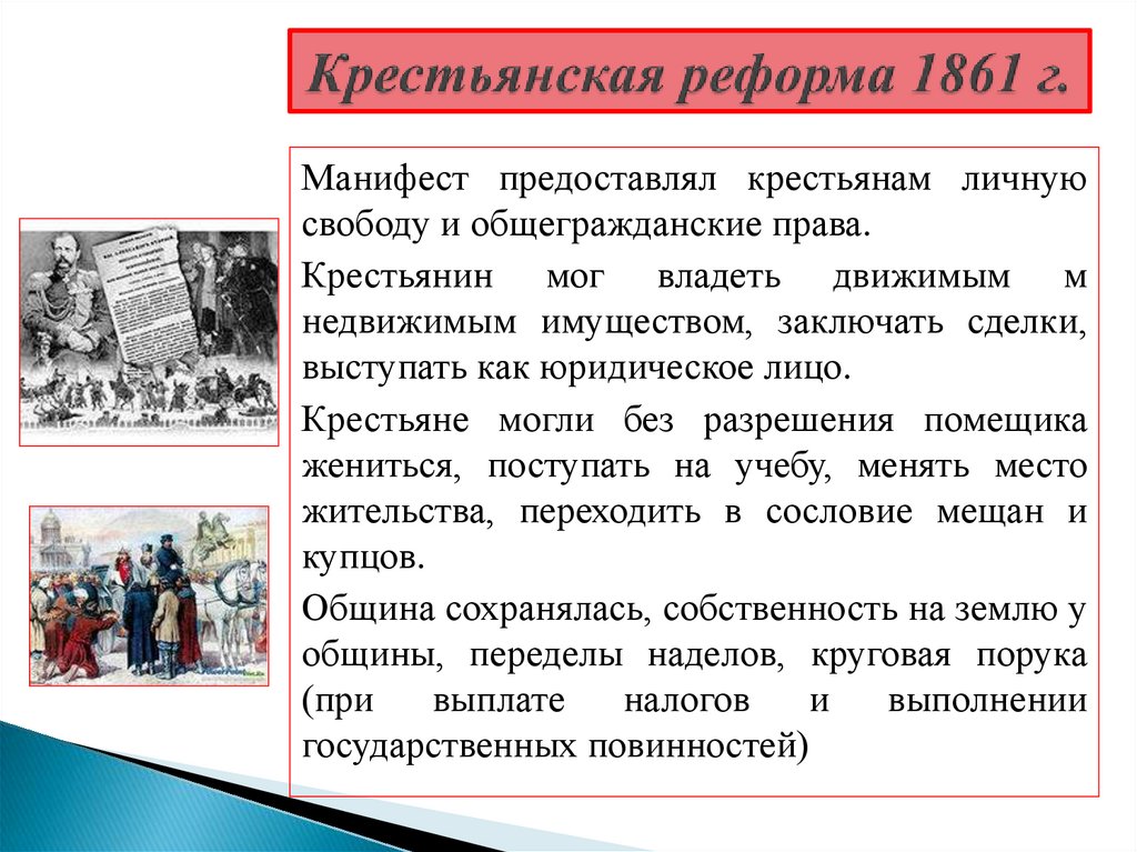Манифест предоставлял крестьянам личнуюсвободу и общегражданские права.