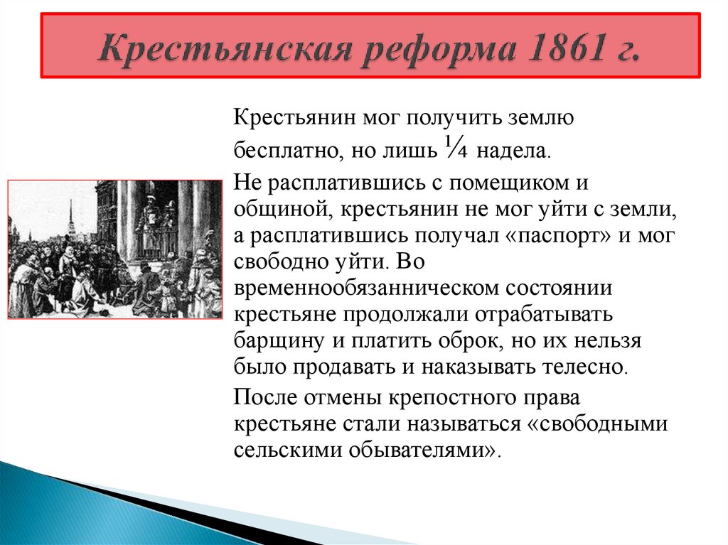 Крестьянин мог получить землюбесплатно, но лишь ¼ надела.