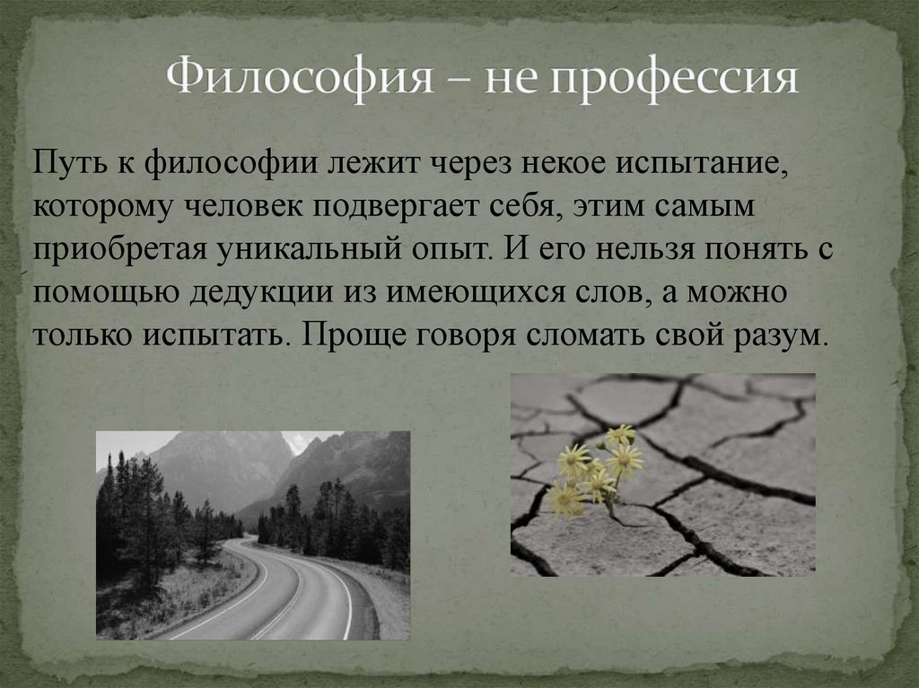 Путь к философии лежит через некое испытание,которому человек подвергает себя, этим самым