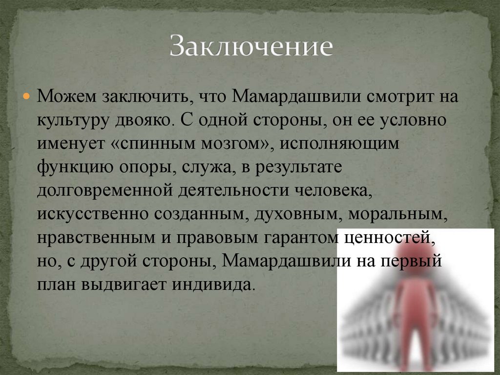 Можем заключить, что Мамардашвили смотрит накультуру двояко. С одной стороны, он ее условно