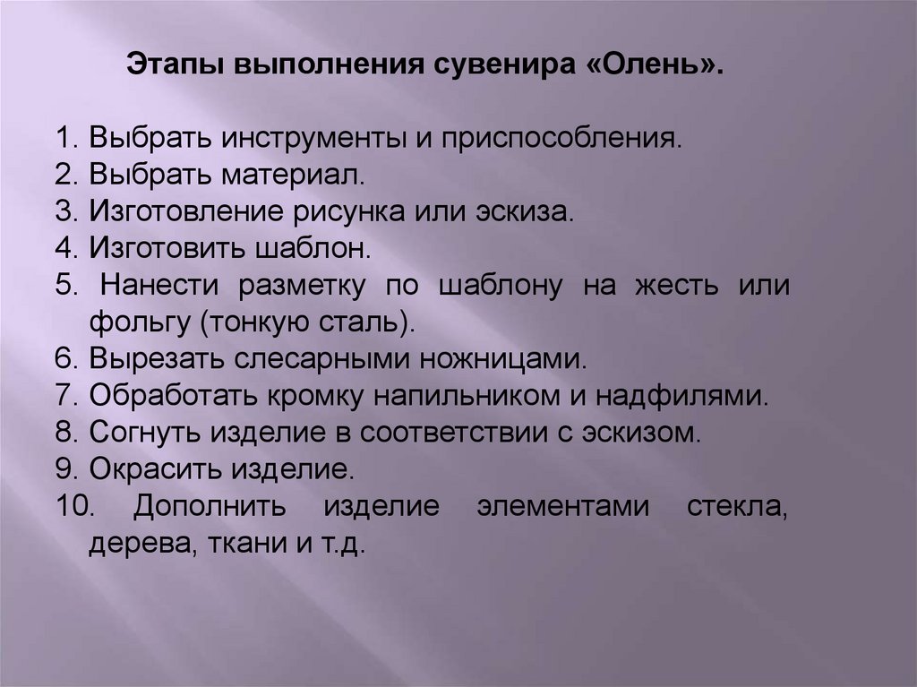 Этапы выполнения сувенира «Олень».1. Выбрать инструменты и приспособления.
