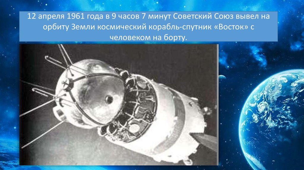 12 апреля 1961 года в 9 часов 7 минут Советский Союз вывел наорбиту Земли космический корабль-спутник «Восток» с