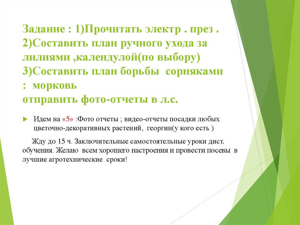Задание : 1)Прочитать электр . през .2)Составить план ручного ухода за