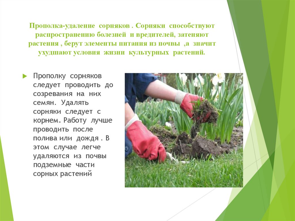Прополка-удаление сорняков . Сорняки способствуютраспространению болезней и вредителей, затеняют