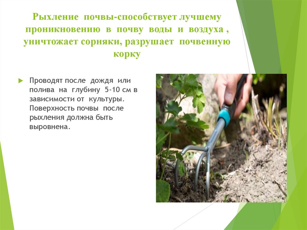 Рыхление почвы-способствует лучшемупроникновению в почву воды и воздуха ,