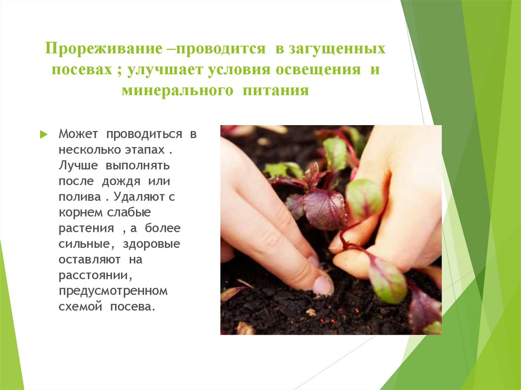 Прореживание –проводится в загущенныхпосевах ; улучшает условия освещения и