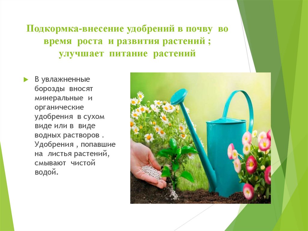 Подкормка-внесение удобрений в почву вовремя роста и развития растений ;